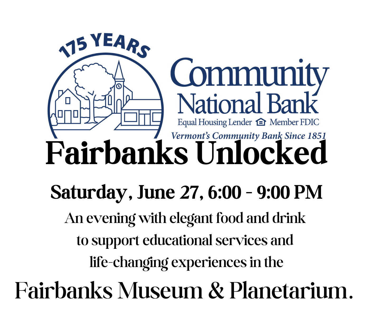 Community National Bank’s Fairbanks Unlocked is your invitation to step beyond the boundaries and experience the magic behind the scenes of the Fairbanks Museum! It’s an invitation to journey to the stars, play with science, and test your naturalist knowledge while supporting essential science education and expansive learning in a true Vermont treasure.